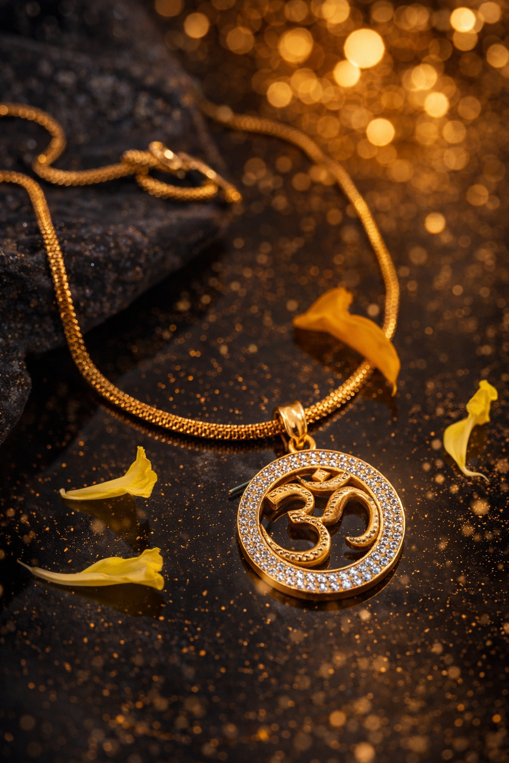 The gold-plated finish holds a beautifully crafted Chain with Om pendant, symbolizing power, protection, and spiritual energy.