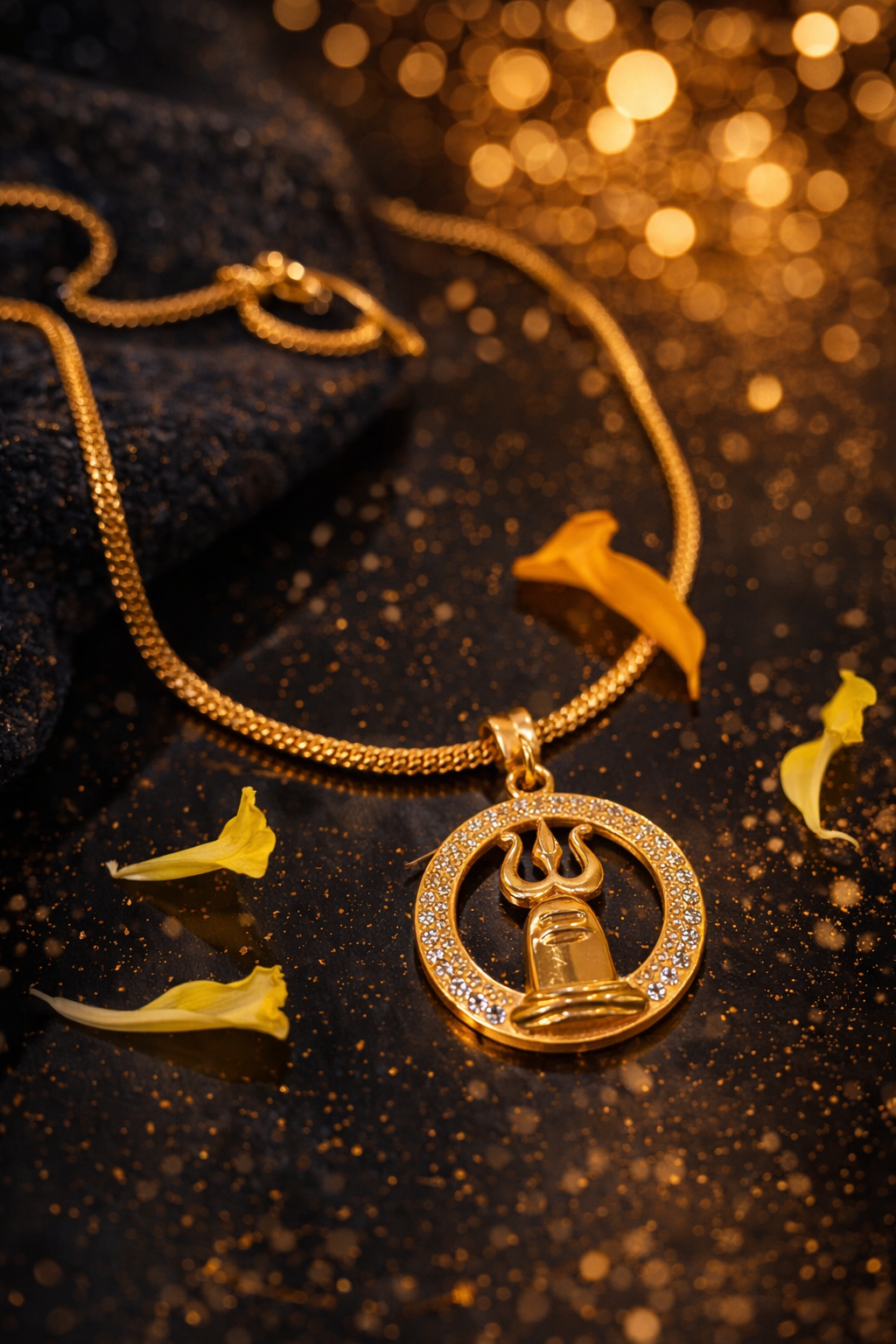 The gold-plated finish holds a beautifully crafted Trishul pendant, symbolizing power, protection, and spiritual energy.